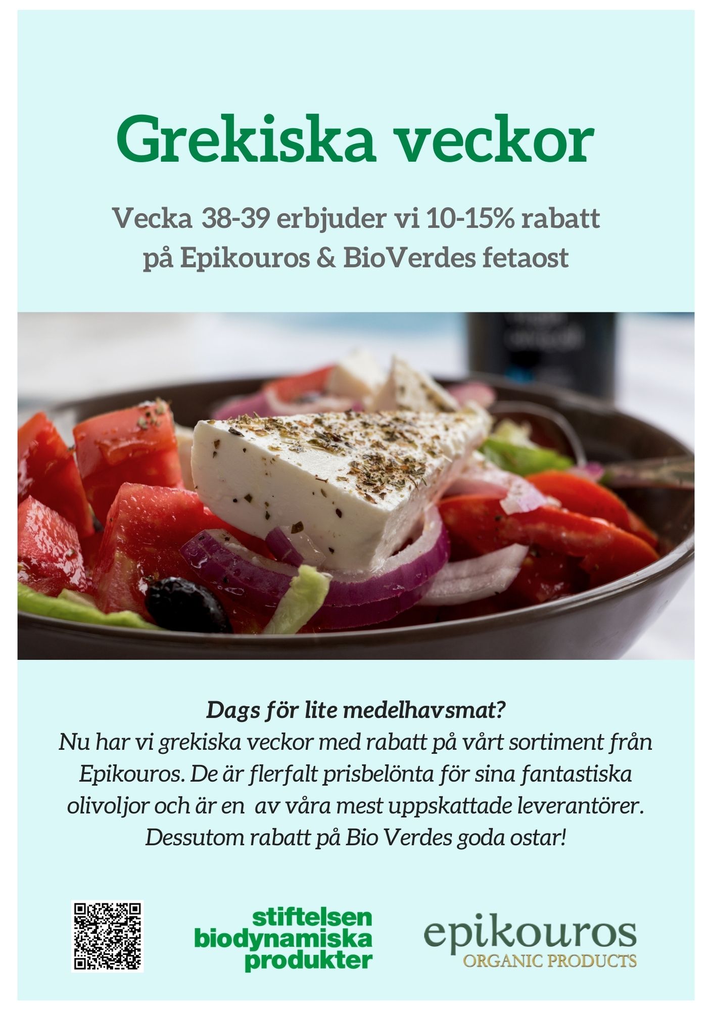 Vecka 38-39 erbjuder vi 10-15% rabatt på Epikouros & BioVerdes fetaost.